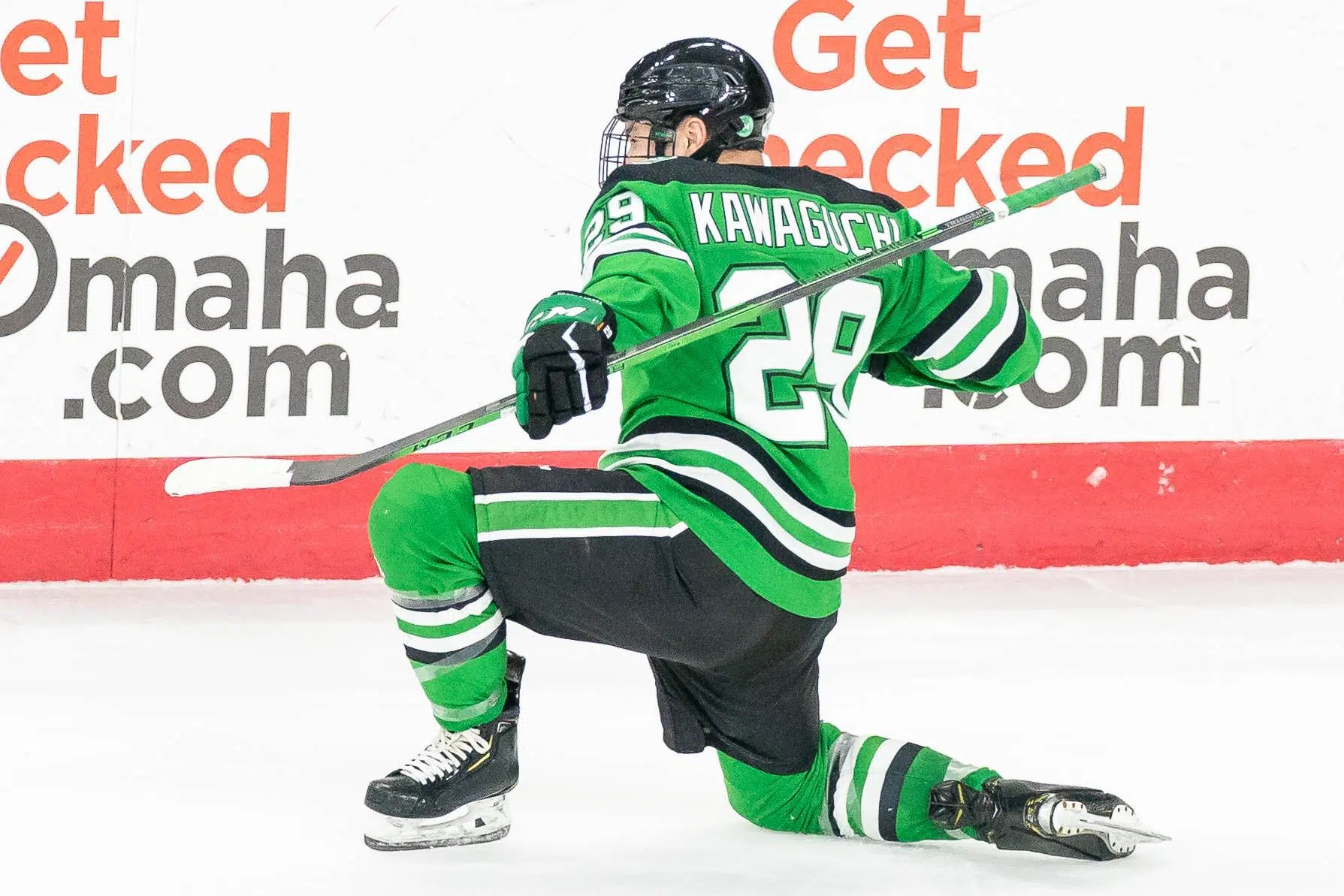 Jordan Kawaguchi became the 86th member of North Dakota’s 100 career point club. His assist and goal in Wednesday’s win over St. Cloud State gave him 101 for his career.