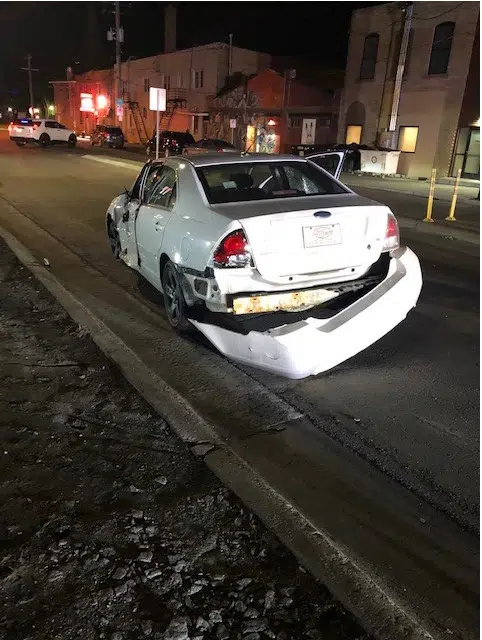FARGO, N.D. (KFGO) – A car collided with a train at a crossing in downtown Fargo. It happened around 10:20 p.m. Sunday in the 500 block of Roberts Street. Police found a car damaged and abandoned, as the driver and a passenger had fled the scene.