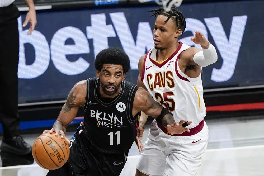 Brooklyn Nets' Kyrie Irving (11) drives past Cleveland Cavaliers' Isaac Okoro (35) during the first half of an NBA basketball game Sunday, May 16, 2021, in New York. (AP Photo/Frank Franklin II)