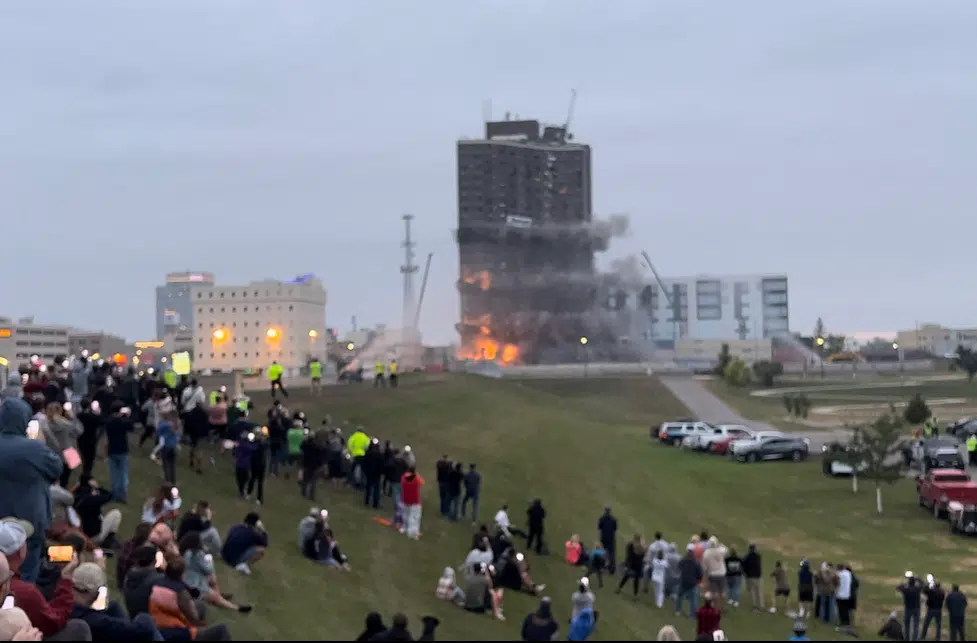 FARGO (KFGO) – Thousands were on hand in downtown Fargo to watch as the Lashkowitz High Rise was imploded Saturday morning.
