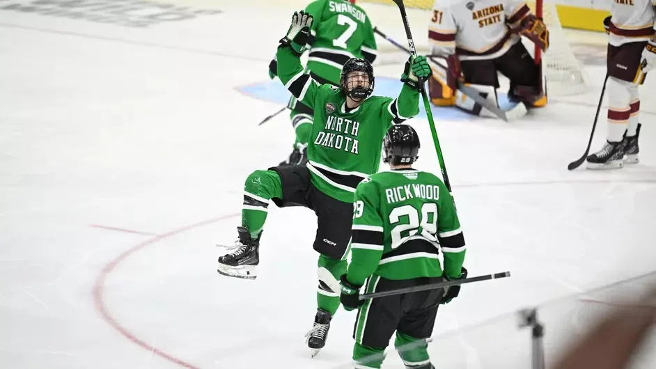 GRAND FORKS, N.D. (UND Athletics)– No. 6 North Dakota struck for three goals in the third period to break a 2-2 deadlock and defeat Arizona State, 5-2, on Friday night in front of a sellout crowd of 11,572 at Ralph Engelstad Arena in Grand Forks, N.D.