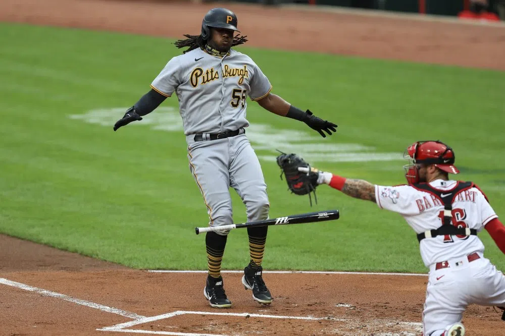 Pittsburgh Pirates' Josh Bell (55) reacts to drawing a walk as Cincinnati Reds' Tucker Barnhart (16) reacts in the first inning during a baseball game at in Cincinnati, Friday, Aug. 14, 2020. (AP Photo/Aaron Doster)